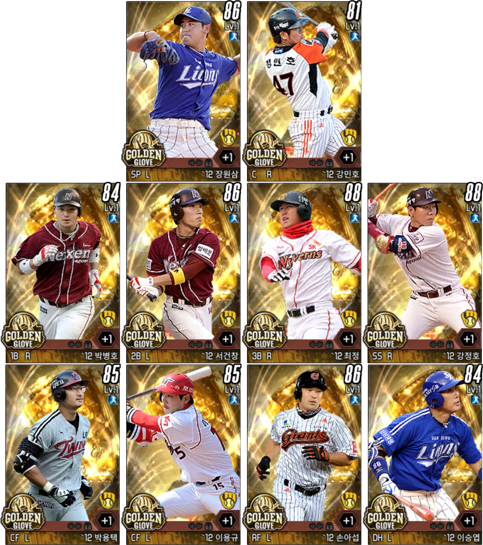 선발 투수 SP 포수 C 장원삼 강민호 1루수 1B 2루수 2B 3루수 3B 유격수 SS 박병호 서건창 최정 강정호 중견수 CF 중견수 CF 우익수 RF 지명 타자 DH 박용택 이용규 손아섭 이승엽 골든 글러브